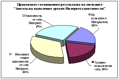 Анализ результатов, представленных в таблице 2 и на рис. 1 - 2, позволяет утверждать, что для большинства испытуемых характерен начальный уровень зависимости от сети Интернет. Этот результат присущ 33% исследовательской группы. Они испытывают некоторое количество проблем из-за Интернета. Им стоит учитывать серьёзное влияние сети на их жизнь, так как это путь к Интернет-зависимости, и стараться сокращать время, проводимое во «Всемирной паутине».