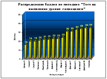 Рис. 3. Распределение баллов по методике «Оценка уровня общительности» (тест Ряховского) Для 60% исследовательской группы характерна общительность, порой, быть может, даже сверх меры, любопытство, разговорчивость, они любят высказываться по разным вопросам, что, бывает, вызывает раздражение окружающих. Охотно знакомятся с новыми людьми, любят бывать в центре внимания, никому не отказывают в просьбе, хотя не всегда могут это выполнить. Бывают вспыльчивы, но быстро отходят. Им недостаёт лишь усидчивости, терпения и отваги при столкновении с серьёзными проблемами, но при желании они вполне могут заставить себя не отступать. 27% испытуемых исследовательской группы характерна позиция «рубаха-парень». Общительность бьёт из них ключом. Они всегда в курсе всех дел, любят принимать участие во всех дискуссиях, хотя серьёзные темы могут вызвать у них мигрень или даже хандру. Охотно берут слово по любому вопросу, даже если имеют о нём поверхностное представление. Всюду чувствуют себя в своей тарелке. Берутся за любое дело, хотя не всегда могут успешно довести его до конца. По этой самой причине руководители и коллеги относятся к этим людям с некоторой опаской и сомнениями. Им следует задуматься над этими фактами. 13% испытуемых относятся к людям с нормальной коммуникабельностью. Они любознательны, охотно слушают интересного собеседника, достаточно терпеливы в общении с другими, отстаивают свою точку зрения без вспыльчивости. Без неприятных переживаний идут на встречу с новыми людьми. Но в то же время не любят шумных компаний, экстравагантные выходки и многословие вызывают у них раздражение. Испытуемых с низкой коммуникабельностью в исследовательской группе выявлено не было. Результаты диагностики по методике «Тест на выявление уровня самооценки» представлены в таблице 4 и на рис. 4. Таблица 4 Результаты диагностики по методике "Тест на выявление уровня самооценки"