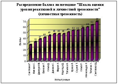 Рис. 4. Распределение баллов по методике «Тест на выявление уровня самооценки» Анализ данных, представленных в таблице 4 и на рис.4, позволяет утверждать, что 60% испытуемых недовольны собой, их мучают сомнения и неудовлетворённость собственным интеллектом, способностями, достижениями, внешностью, возрастом, полом. У них занижена самооценка, и стоит предпринять меры для того, чтобы избавиться от этих проблем в восприятии себя. 40% исследовательской группы живут в согласии с собой, знают себя и могут себе доверять. Они обладают ценным умением находить выход из трудных ситуаций как личного характера, так и во взаимоотношениях с людьми. Формулу их отношения к себе и окружающим можно выразить словами: «Доволен собой, доволен другими». У них нормальная здоровая самооценка, они умеют быть для себя поддержкой и источником силы и, что самое главное, не за счёт других. Испытуемых с высокой самооценкой в исследовательской группе выявлено не было. Результаты диагностики по методике «Шкала оценки уровня реактивной и личностной тревожности» (Ч.Д. Спилберг, Ю.Л. Ханин) представлены в таблице 5 и на рис. 5–6. Таблица 5 Результаты диагностики по методике «Шкала оценки уровня реактивной и личностной тревожности» (Ч.Д. Спилберг, Ю.Л. Ханин)