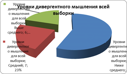 Рис. 4. Уровень дивергентного мышления студентов технических специальностей Как можно видеть из таблиц 2 и 3, студенты обоих подвыборок склонны к завышению уровня своих творческих способностей. Это может быть обусловлено неадекватным восприятием своего уровня творчества, или же фактором социальной желательности. Но, тем не менее, более к этому склонна техническая подвыборка. Таблица 4. Частота встречаемости тестовых баллов для всей выборки (сгруппированные данные)