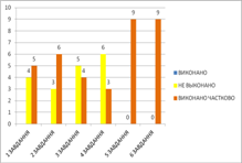 Малюнок 7 Вихователь: Молодці, діти! Подивіться, замок відкрився, а за дверима дійсно Золотий ключик. Ви правильно виконали завдання й допомогли Буратіно знайти Золотий ключик. Що вам найбільше сподобалося в нашій подорожі? А що вам здалося самим важким? Для виявлення рівня вмінь кожної дитини ми склали таблицю, у яку помістили результати відповідей дітей на кожне завдання заняття. Оцінка результатів завдання по рівнях. Низький - 0-4 балів; Середній - 5-9 балів; Високий - 10-12 балів. Виходячи з результатів таблиці ми бачимо, немає жодної дитини, яка б відповіла вірно на всі запитання (0%); частково виконали завдання, 9 дітей або 100% з них: - 3 дітей (33,3%) із середнім рівнем умінь - 6 дітей (67,7%) з низьким рівнем умінь. Особливо важко далися дітям відповіді на запитання 3 і 4 завдання. Діти при відповіді на питання цих завдань поводилися розгублено, плуталися у своїх відповідях. Олексій С., Віка К., Віка Д., Євген Б., Олег С., не змогли вчасно відповісти яке число більше і яке менше 4 на 1, тому відповідь на це запитання ним не була зарахована. При відповіді на питання 4 завдання 6 дітей (Віка К., Віка Д., Данило С., Євген Б., Олена П, Олег С) відповіли, що більше більших гусаків, а менше маленьких гусенят. Це говорить про те, що із цими дітьми мало ведеться робота з визначення незалежності числа предметів від їхньої величини. Причому ця робота не повинна обмежувати тільки заняттями по математиці, але й здійснюватися й у вільній ігровій діяльності дітей. За результатами завдань ми склали діаграму (Рис.1) з якої видно які завдання викликали труднощі у дітей.