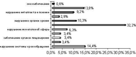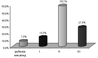 Рис. 1 Структура инвалидности по г. Кумертау на 01.01 2004 г. За период с 04.02.2002 г. по 14.06.2003г. проведена работа по сбору и обработке информации. Были выборочно взяты амбулаторные карты и эпикризы на 174 человек, прошедших реабилитацию, а также проведено их анкетирование. За отчетный период прошли курс реабилитации лиц мужского пола 98 чел. (56,3 %) и женского пола 76 чел. (43,7%), что на 22 чел (12,6 %) меньше, чем мужчин (cм. Приложение рис 1). Возраст реабилитируемых обусловлен направлением деятельности учреждения, 67,2 % составляют дети и подростки (см. Приложение рис. 2). Территориально работа ведется по городу и на близ лежащие районы юга республики, на которые приходится 8,6 % посещений (см. Приложение рис. 3). Самой многочисленной группой инвалидов являются – дети- инвалиды (67,2%). В группе взрослых самая многочисленная II группа инвалидности: на 8% выше ,чем III группа и на 10,9% выше, чем I группа (см. Приложение рис. 4). При этом стаж инвалидности у 80,2% больше 6 лет , что в целом влияет на эффективность восстановительных мероприятий. Среди причин инвалидности на первом месте - общие заболевания. Так 70% составляют нарушения ОДА, нервные и психические заболевания, нарушения интеллекта и заболевания системы кровообращения (рис.2)