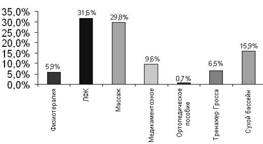 Рис. 2 Причины инвалидности реабилитируемых в Кумертауском центре Состояние большинства поступивших оценивается как удовлетворительное 91,4 % (см. Приложение рис..5). Для более эффективного восстановления и адаптации данный контингент лиц должен получать адекватное, продолжительное по количеству процедур занятий и количеству курсов. Так за 16 календарных месяцев 23% инвалидов прошли более трех курсов, а 47,1 % один-два курса, что связано скорее с небольшим сроком работы данного центра и накоплением базы данных о всех подопечных (см. Приложение рис.6). Учитывая специфичность задач, целей, методов и методик направления реабилитации, количество процедур и занятий варьируется в зависимости от заболевания, степени нарушения и т.д. Так продолжительность курса физической реабилитации в большинстве своем составляет до 10 дней, чуть больше 73% (см. Приложение рис 7) При этом курс социальной реабилитации составляет 44,3% от 15 до 30 дней (см. Приложение рис. 8). Почти 100% назначений это занятия по лечебной физкультуре, 93% получает массаж, 20% занимаются на тренажере Гросса, приблизительно 29,9% получает медикоментозную терапию. 2,3% была оказана помощь в освоении ортопедических пособий. 49,9% детей до 18 лет "поплавали" в сухом бассейне ( рис.3).