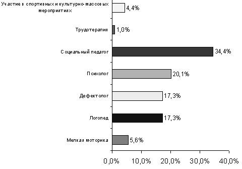 Рис. 3 Медицинские средства реабилитации, применяемые в Кумертауском реабилитационном центре Социальная реабилитация начинается с посещения социального педагога. Психологическая помощь оказана 56% человек. Потребности в этой услуге гораздо шире, но в данный период ограничивались этим количеством из-за недостаточности высококвалифицированных специалистов. Из данной группы исследуемых 12,5 % постоянно участвуют в спортивных и культурно-массовых мероприятиях. Половина занимающихся нуждаются в уроках с логопедами и дефектологами, которые проводят сеансы по мелкой моторике ( рис. 4).