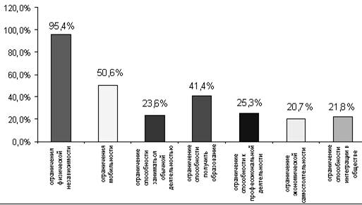 Многие отмечают именно отсутствие независимости как физической 95,4%, экономической 20,7%, так и свободы передвижения или мобильности 50,5%. Но в тоже время большой процент имеют ограничения как зависимые, так и независимые от их желания и возможности: получать образование- 41,3%, заниматься профессиональной деятельностью 25,2% и просто заниматься обычной деятельностью 23,5%. Что в итоге сказывается на интеграции человека (инвалида) в обществе. 21,8 % респондентов не могут влиться в нормальный ритм жизни (рис 5).