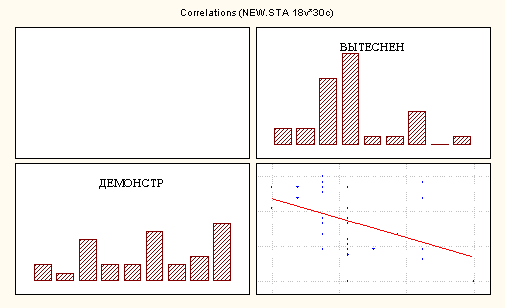 Учитывая полученные результаты расчета линейной корреляции Пирсона, можно сделать выводы: 1. Между вытеснением и демонстративным типом характера существует статистически значимая (r =׀0,451׀,p < 0,05) отрицательная слабая взаимосвязь, т.е. для данной выборки низкие показатели по демонстративному типу характера обратнопропорционально связаны с высокими показателями по вытеснению, и наоборот, высокие показателей по демонстративному типу характера обратнопропорционально связаны с низкими показателями по вытеснению.