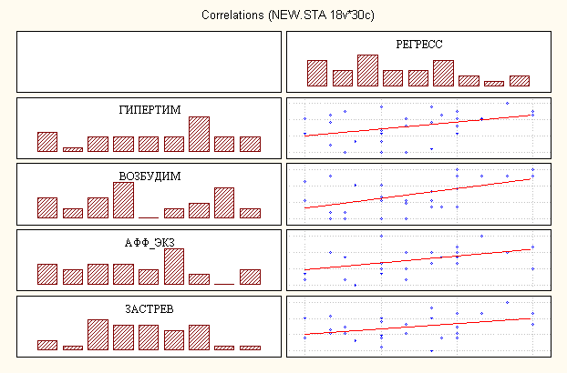 ВЫТЕСН – вытеснение; ДЕМОНСТР – демонстративный Рис. 2.1 – Матричный график корреляции Таким образом, проанализировав таблицу 2.2 и рисунок 2.1, можно заключить, что чем ниже показатели по демонстративной акцентуации характера, тем выше показатели по вытеснению, и наоборот, чем выше показатели по демонстративной акцентуации характера, тем ниже показатели по вытеснению. 2. Между регрессией и гипертимным типом характера существует статистически значимая (r =0,393, p < 0,05) положительная слабая взаимосвязь. То есть высокие показатели по регрессии прямопропорционально связаны с высокими показателями по гипертимной акцентуации, и наоборот, низкие показатели по регрессии прямопропорционально связаны с низкими показателями по гипертимной акцентуации. 3. Между регрессией и возбудимым типом акцентуации существует статистически значимая (r =0,519, p < 0,005) положительная умеренная взаимосвязь. То есть высокие показатели по регрессии прямопропорционально связаны с высокими показателями по возбудимой акцентуации, и наоборот, низкие показатели по регрессии прямопропорционально связаны с низкими показателями по возбудимой акцентуацией характера. 4. Между регрессией и аффективно–экзальтированным типом характера существует статистически значимая (r =0,432, p < 0,05) положительная слабая взаимосвязь. То есть высокие показатели по регрессии прямопропорционально связаны с высоким показателями по аффективно–экзальтированной акцентуации, и наоборот, низкие показатели по регрессии прямопропорционально связаны с низкими показатели по аффективно–экзальтированной акцентуации характера. 5. Между регрессией и застревающим типом акцентуации существует статистически значимая (r =0,376, p < 0,05) положительная слабая взаимосвязь. То есть высокие показатели по регрессии прямопропорционально связаны с высокими показателями по застревающей акцентуации, и наоборот, низкие показатели по регрессии прямопропорционально связаны с низкими показателями по застревающей акцентуации.