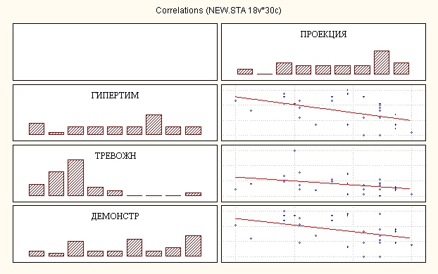 РЕГРЕСС – регрессия; ГИПЕРТИМ – гипертимный тип акцентуации; ВОЗБУДИМ – возбудимый тип акцентуации; АФФ_ЭКЗ – аффективно–экзальтированный тип акцентуации; ЗАСТРЕВ – застревающий тип акцентуации Рис. 2.2 – Матричный график корреляции Таким образом, проанализировав таблицу 2.2 и рисунок 2.2, можно заключить, что чем выше показатели по гипертимному, возбудимомому, аффективно–экзальтированному и застревающему типам акцентуации, тем выше показатели по регрессии, и наоборот, чем выше показатели по регрессии, тем выше показатели по гипертимному, возбудимомому, аффективно–экзальтированному и застревающему типам акцентуации. 6. Между проекцией и гипертимным типом характера существует статистически значимая (r =׀0,461׀, p = 0,01) отрицательная слабая взаимосвязь. То есть низкие показатели по проекции обратнопропорционально связаны с высокими показателями по гипертимной акцентуации, и наоборот, высокие показатели по проекции обратнопропорционально связаны с низкими показателями по гипертимной акцентуации. 7. Между проекцией и тревожно–боязливым типом акцентуации характера существует статистически значимая (r =׀0,370׀, p < 0,05) отрицательная слабая взаимосвязь. То есть низкие показатели по проекции обратнопропорционально связаны с высокими показателями по тревожно–боязливой акцентуации, и наоборот, высокие показатели по проекции обратнопропорционально связаны с низкими показателями по тревожно–боязливой акцентуации. 8. Между проекцией и демонстративным типом характера существует статистически значимая (r =׀0,404׀, p < 0,05) отрицательная слабая взаимосвязь. То есть высокие показатели по проекции обратнопропорционально связаны с низкими показателями по демонстративной акцентуации, и наоборот, низкие показатели по проекции обратнопропорционально связаны с высокими показателями по демонстративной акцентуации. 9. Таким образом, проанализировав таблицу 2.2 и рисунок 2.3, можно заключить, что чем выше показатели по гипертимному, тревожному и демонстративному типам акцентуации, тем ниже показатели по проекции, и наоборот, чем ниже показатели по гипертимному, тревожному и демонстративному типам акцентуации, тем выше показатели по проекции.