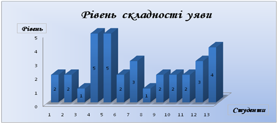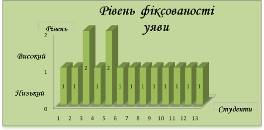 Рівень складності уяви» показав, що у десяти із тринадцяти осіб рівень складності уяви низький, у студента під №13 – середній рівень, а у номерів 4 і 5 – високий рівень складності уяви. 2.3.2 Рівень фіксованості уявиАналіз результатів експериментальної групи представлений у вигляді гістограми 2.