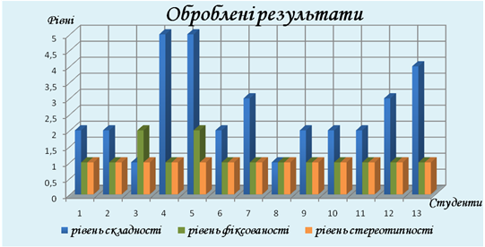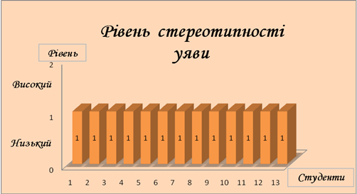 Рівень фіксованості уяви» показав, що у одинадцяти осіб із тринадцяти слабко фіксована уява. А у студентів під номерами 3 і 5 – високий рівень фіксованості уяви. 2.3.3 Рівень стереотипності уявиАналіз результатів експериментальної групи представлений у вигляді гістограми 3.