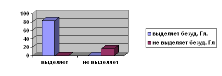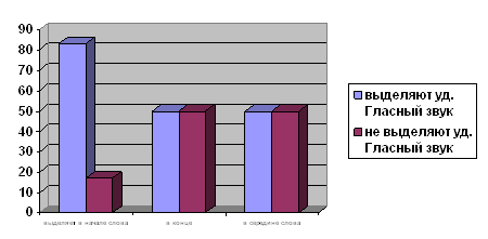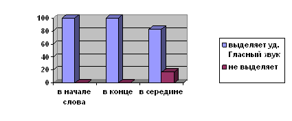 При анализе результатов обследования фонематического анализа у детей младшего школьного возраста без билингвизма было выявлено, что 100% исследуемых детей выделяют ударный гласный звук в начале слова, в конце слова, а в середине слова выделяют только 83% детей, а 17% не выделяют. Данные представлены в диаграмме 5. Диаграмма 5 Выделение ударного гласного звука ( в начале, в конце, в середине)
