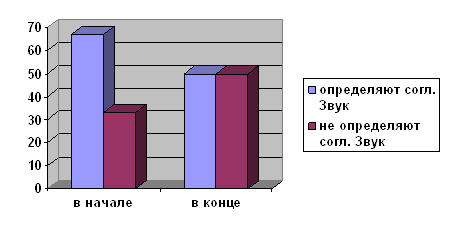 При определении согласного звука, было выявлено, что 67% определяют в начале слова согласный звук, а 33% не выделяют согласный звук в начале слова. Данные представлены в диаграмме 2. Диаграмма 2 Определение согласного звука (в начале, в конце)