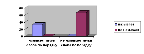 При назывании звук слова по порядку было выявлено, что 33% детей назвали звуки слова по порядку, а 67% детей не назвали звуки слова по порядку. Данные представлены в диаграмме 4. Диаграмма 4 Назвать звуки слова по порядку