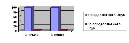 При определении согласного звука, было выявлено, что 100% детей определяют согласный звук в начале слова и 100% детей определяют согласный звук в конце слова. Данные представлены в диаграмме 6. Диаграмма 6 Определение согласного звука ( в начале, в конце)