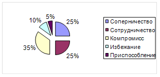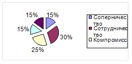 Рис.1. Процентное соотношение способов поведения в конфликте в общей выборке. В общей выборке наметилась следующая тенденция: способ поведения сотрудничество выбирается в большинстве случаев – 30 % компромисс предпочитают 25 % способы поведения соперничество, избегание и приспособление составляю 15 %