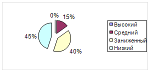 Рис. 9. Процентное соотношение испытуемых с различным уровнем эмпатии в общей выборке. Большинство супругов обладают низким и заниженным уровнем эмпатии. Только 15 % супругов имеют средний уровень эмпатии. А высоким уровнем эмпатии не обладает ни один из супругов.