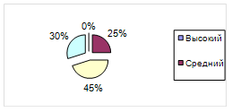 Рис. 10. Процентное соотношение испытуемых с различным уровнем эмпатии в женской выборке. Заниженный уровень эмпатии наблюдается у 45 % женщин, низкий – у 30 % и средний – у 25 %.