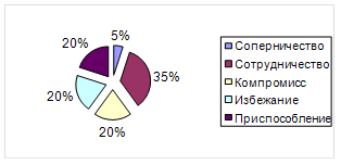 Рис.2. Процентное соотношение способов поведения в конфликте в женской выборке. Для женщин характерно превалирование способа поведения сотрудничество – 35 %. Способ поведения компромисс, избегание и приспособление выбирается в 20 % случаев, соперничество выбирают наименьшее количество женщин – 5 %.