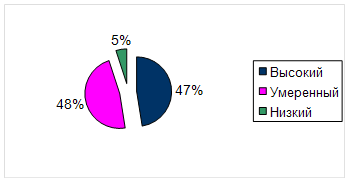 Рис. 4. Процентное соотношение испытуемых с различным уровнем тревожности в общей выборке. У большинства супругов наблюдается высокий и умеренный уровень тревожности – 47% и 48 % соответственно. Всего 5 % супругов обладают низким уровнем тревожности.