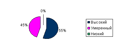 Рис. 5. Процентное соотношение испытуемых с различным уровнем тревожности в женской выборке. У женщин в большинстве случаев наблюдается высокий уровень тревожности – 55 %. Умеренный уровень тревожности наблюдается у 45 %, а низкого уровня тревожности нет ни у одной женщины.