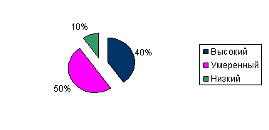 Рис. 6. Процентное соотношение испытуемых с различным уровнем тревожности в мужской выборке. У мужчин в большинстве случаев наблюдается умеренный уровень тревожности – 50 %. Высокий уровень – у 40 % мужчин. И в отличие от женщин 10 % мужчин обладают низким уровнем тревожности. Таким образом, у женщин наблюдается повышенный уровень тревожности в силу того, что на ее плечи ложится большая ответственность за рождение и воспитание детей и выполнение хозяйственно-бытовых обязанностей, что является основой для нормального функционирования семейной структуры. В сложившейся экономической ситуации современного общества женщине приходится выполнять не только выше перечисленные обязанности, но и заниматься профессиональной деятельностью, обеспечивая должный уровень материального достатка семьи. Сравнительный анализ уровня нейротизма (эмоциональной стабильности-нестабильности) мужчин и женщин Таблица 3 Процентное соотношение испытуемых с различным уровнем нейротизма (эмоциональной стабильности-нестабильности).