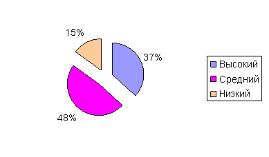 Рис. 7. Процентное соотношение испытуемых с различным уровнем нейротизма (эмоциональной стабильности-нестабильности) в общей выборке. У большинства супругов наблюдается средний уровень нейротизма (средняя стабильность) – 48 %. Эмоционально нестабильными являются 37 % супругов, соответственно имеют высокий уровень нейротизма. 15 % супругов обладают низким уровнем нейротизма и являются эмоционально стабильными.