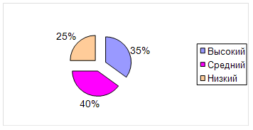 Рис.3. Процентное соотношение стратегий поведения в конфликте в мужской выборке. У мужчин наблюдается следующее: компромисс – 35 % сотрудничество и соперничество – 25 % избегание – 10 % приспособление – 5 % Таким образом, можно отметить, что женщины предпочитают сотрудничество в качестве способа поведения в конфликтной ситуации. В свою очередь мужчины разрешают конфликты в большинстве случаев (35%) компромиссом. Однако женщины в отличие от мужчин стараются избегать такого способа поведения в конфликте как соперничество (в мужской выборке оно составляет 25%), отдавая приоритет компромиссу, приспособлению и избеганию. Мужчины в свою очередь не приемлют приспособление и избегание в качестве способа поведения в конфликте. Тенденция преобладания компромисс в поведении мужчин объясняется тенденциями к эгалитарности современной семьи. Т.е. возрастает независимость женщины во многих областях семейной жизни (личностная, профессиональная, хозяйственно-бытовая). Мужчина видя компетентность женщины во многих вопросах стремится уступать ей ведущую роль. Однако, оставаясь доминирующим звеном семейных взаимоотношений, мужчина считает для себя непозволительным в силу своей половой принадлежности прибегать к приспособлению и избеганию в конфликтных ситуациях, которые могут показать его слабость и несостоятельность как мужчины. 3.3 Эмпирическое исследование гендерных особенностей эмоциональной сферыСравнительный анализ уровня тревожности мужчин и женщин Таблица 2 Процентное соотношение испытуемых с различным уровнем тревожности.