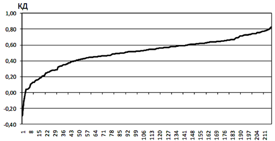 где Этот показатель может принимать значения между –1 и +1 и в системе Moodle называется Коэффициентом Дифференциации (КД). Его использование в качестве характеристики способности конкретного тестового задания правильно дифференцировать испытуемых по степени их подготовки, основано на том, что в качественном тесте в среднем более высокие баллы при ответе на каждое конкретное задание теста должны получать испытуемые, набирающие более высокую сумму баллов за выполнение теста в целом. То есть между этими значениями должна быть положительная корреляция. Отрицательные же значения этого коэффициента свидетельствуют о том, что при ответе на данное задание более «слабые» испытуемые в среднем получают более высокие баллы, чем более «сильные» испытуемые. Очевидно, что такие задания, возможно, в силу допущенных ошибок в их формулировке или каких-либо иных причин не являются настоящими тестовыми заданиями, и их также следует удалять из теста. На рисунке 5 приведен пример упорядоченных по величине значений коэффициента дифференциации, полученные для тех же тестовых заданий, что и в примере на рисунке 6.