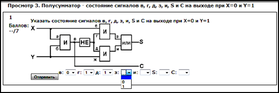 Рис. 7. Пример объединения в одном тестовом задании нескольких вопросов с выбором одного из двух состояний Большие возможности с точки зрения составления тестовых заданий с низкой возможностью угадывания правильных ответов в системе Moodle предоставляет тип задания, называемый Вложенные ответы, позволяющий объединять в одном задании вопросы с ответами разных типов. Задания типа Вложенные ответы состоят из текста, непосредственно в который вставляются ответы на вложенные в этот текст вопросы типов – Множественный выбор, Короткие ответы и Числовые (рис. 8).