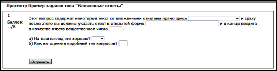 Рис. 8. Пример тестового задания типа Вложенные ответы Другим практически значимым фактором, нарушающим принцип равенства требований и условий проведения тестирования для всех испытуемых, является возможность получения испытуемыми во время прохождения тестирования доступа к правильным ответам на задания теста. Каналами такого доступа могут быть подсказки других испытуемых, подсматривание ответов у соседа, использование шпаргалок, а сейчас и использование сторонней дистанционной помощи с применением современных технических средств компьютерной и мобильной связи. Для противодействия возможностям такой компрометации процедуры тестирования используется целый ряд известных средств. Во-первых, это использование в тестовых заданиях типа Множественный выбор опции случайного перемешивания ответов при каждом предъявлении задания испытуемым. Это устраняет связывание правильных ответов с порядковым номером предъявляемых ответов, исключая использование порядкового номера правильных ответов при составлении шпаргалок и списывании. Опыт использования тестовых технологий показывает, что при формировании набора тестовых заданий составляющих тест, предназначенный для многократного использования для разных тестируемых, является совершенно не оправданным предположение о том, что используемый в тесте фиксированный набор заданий может оставаться неизвестным и неожиданным для испытуемых сколько-нибудь продолжительное время. Для обеспечения действительно надежного фактора новизны предлагаемого конкретному испытуемому набора тестовых заданий наиболее эффективным является формирование сценария теста путем случайного выбора каждого конкретного тестового задания из множества однотипных заданий, однородных по уровню сложности. Такое формирование тестов может быть обеспечено только при наличии достаточно большого исходного банка тестовых заданий по каждому разделу учебной дисциплины, по которой осуществляется контроль знаний испытуемых.