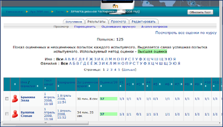 Рис. 1. Скриншот системы Moodle со списком испытуемых, прошедших тестирование, и полученных ими результатов
