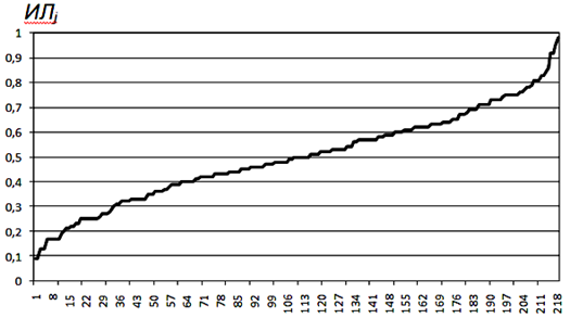 Рис. 3. Значения индекса легкости заданий для тестируемой группы Представленные данные свидетельствуют о том, что используемая в примере база тестовых заданий достаточно равномерно представляет вопросы различного уровня сложности, при этом очень легких – «очевидных для всех» и очень сложных – «никем не решаемых» (то есть нетестовых заданий) практически нет, что говорит о соответствии комплекса заданий этого теста среднему уровню подготовки испытуемой группы. Другой