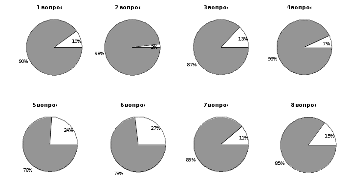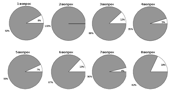 Анализируя результаты тестирования, проведенного по двум вариантам, следует отметить, что несмотря на сложность материала предполагаемого для изучения школьникам, он воспринимается ими успешно. Об этом говорят данные, наглядно представленные на диаграммах №№ 3-4. Число отрицательных ответов по восьми вопросам теста № 1 колеблется от 4 % до 18 %. Наибольшее затруднение вызвал вопрос о незаменимых аминокислотах. Число же отрицательных ответов по второму тесту изменяется от 2 % до 27 %. Однако, как видно из диаграмм №№ 3-4 число правильных ответов по тестам 1-го и 2-го вариантов от 82 % до 95 % (I вариант) и от 73 % до 98 % (II вариант). Это доказывает доступность для изучения предлагаемого содержания спецкурса, а отобранный материал может быть рекомендован для изучения в условиях средней школы. Выводы по III главе.