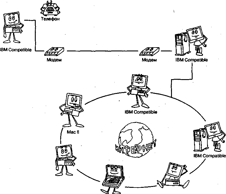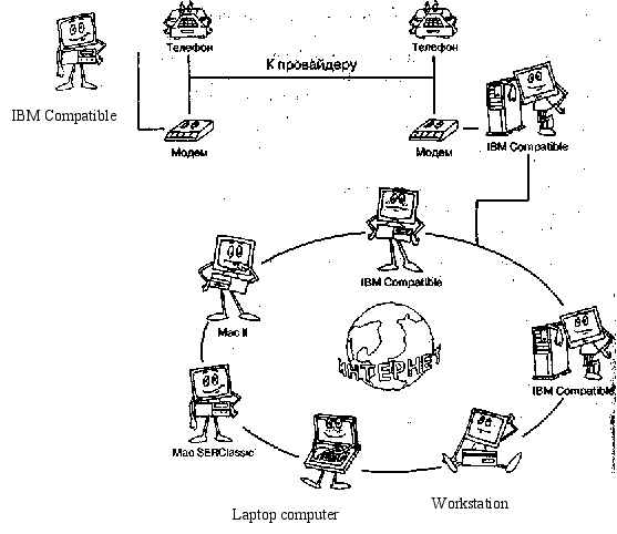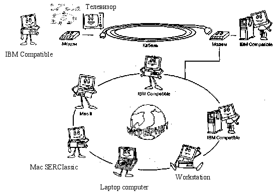 Мал. 2.5. Доступ через мережу кабельного телебачення 3. Як улаштовані модемиДля підключення вилучених користувачів звичайно використовуються існуючі телефонні мережі. Більшість телефонних мереж бути розроблено для передачі аналогових сигналів - голосу, тоді як комп'ютери працюють з цифровою формою представлення даних - імпульсами. Тому для використання телефонних мереж потрібно перетворити цифровий сигнал в аналоговий. Конвертером (перетворювачем) служить модем, що Модулює і Демодулює цифрові дані. Він приймає послідовність імпульсів, модулює який-небудь з параметрів (амплітуду, чи частоту фазу) аналогового сигналу для передачі даних через аналогове середовище. Приймаючий модем виконує зворотне перетворення, відновлюючи цифрові дані на основі отриманого з мережі аналогового сигналу. Перші модеми використовувалися головним чином для обміну інформацією між терміналами даних і вузлових комп'ютерів; пізніше їх почали використовувати для обміну даними між комп'ютерами, що зажадало більш високої швидкості передачі. У результаті швидкість обміну зросла з 300 біт/з до 55600 біт/с. Сучасні модеми використовують різні методи стиску інформації для додаткового підвищення швидкості обміну, а також методи контролю помилок і їхнього виправлення для забезпечення більш надійного зв'язку. Сьогодні модеми застосовуються для рішення широкого класу задач: голосова пошта, факсимільний зв'язок, обмін інформацією через системи стільникового зв'язку для переносних комп'ютерів, відеоконференції і багато чого іншого. Однак при використанні звичайних телефонних мереж швидкість передачі обмежена, і для її подальшого підвищення необхідно застосовувати інші технології - ISDN чи зв'язок через оптичні кабелі. Для того щоб модеми різних виробників могли обмінюватися даними один з одним, були розроблені спеціальні стандарти. Існує кілька організацій, що займаються розробкою стандартних інтерфейсів: ITU (International Telecommunications Union - Міжнародний Союз по електрозв'язку) при комітеті ООН (Женева, Швейцарія), ISO (International Standards Organisation - Міжнародний комітет зі стандартизації). Ці організації впроваджують стандарти і для модемів, які розроблюються роками і, що публікувалися як серія рекомендацій, позначених префіксом V. Основне призначення стандарту складається в описі протоколу3 обміну даними між модемами. Існують також стандарти де-факто, розроблені окремими виробниками устаткування, що використовують у своїй продукції нові властивості, ще не визначені комітетами зі стандартизації. Коли такі нововведення приймаються іншими виробниками, вони і стають стандартами de-facto. От деякі приклади. Стандарт Bell-100 розроблений компанією Bell Systems для її модемів серій 100 і 200. Модель Bell 103 (300 біт/с), розроблена в 1958 році, була першим модемом для передачі даних по телефонних мережах. Мова Ат-команд (від слова attention - увага), створений фірмою Hayes, використовується зараз усіма виробниками модемів. Ця мова дозволяє керувати модемами - від простого набору номера до вказівки числа дзвоників, після якого модем "піднімає трубку". Ще одним прикладом стандарту de-facto є протоколи MNP, розроблені фірмою Microcom Inc. і використовуються в даний час майже у всіх модемах4. При установці з'єднання між двома модемами відбувається узгодження параметрів (handshaking), що полягає в передач, спеціальних сигналів, що доз