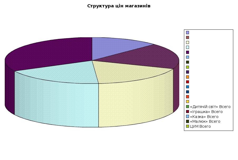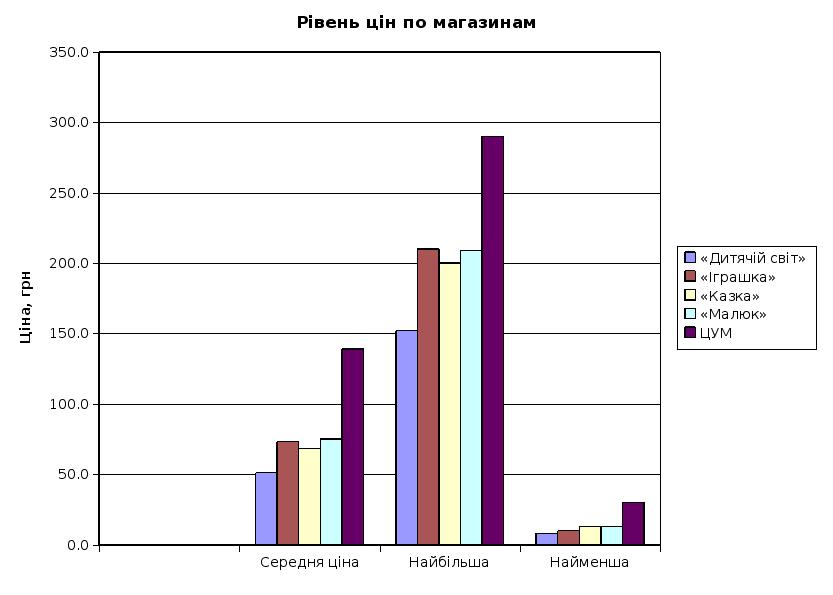 6. Результати обробки інформаціїЦіна на іграшки, які увійшли в базу даних суттєво відрізняється. Так найбільші ціни на іграшки в ЦУМ, а найменші в магазині “Дитячий світ”. Розкид цін на іграшки представлено у Додатку 5. Таблиця 6.1. Дані про середню, мінімальну та максимальну ціну в магазинах м.Павлограда.