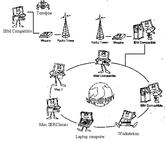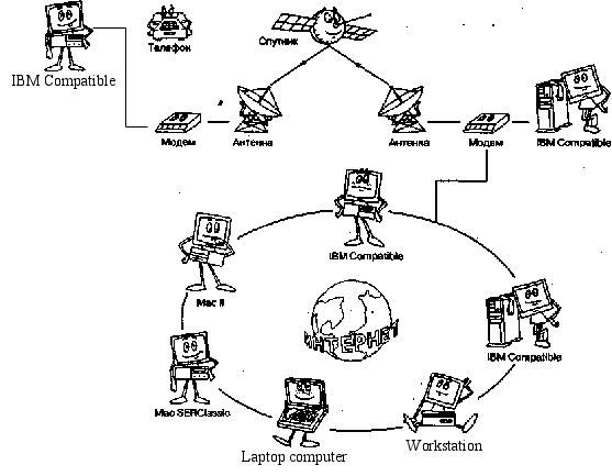 Мал. 2.3. Доступ по радіоканалу 2.4. Супутниковий каналУ Росії доступні послуги двох супутникових систем - DirecPc і NetStat Direct. Перша з них є сервісом фірми Hughes Network System. Для використання системи DirecPc необхідна установка супутникової антени, підключеної через спеціальний адаптер до комп'ютера, і наявність звичайного модему (мал. 2.4). Дані з Internet через супутник надходять на комп'ютер користувача зі швидкістю 400 Кбіт/з, а в зворотному напрямку - приблизно на швидкості звичайного телефонного з'єднання. Тому що в основному при роботі в Internet інформація передається до користувача, то обмеження швидкості передачі даних у зворотну сторону не грає ролі. Технологія DirecPc вимагає, щоб ваш комп'ютер мав як мінімум 486 процесор з тактовою частотою не менш 66 Мгц і операційну систему Windows 3.1. Також підтримуються всі наступні операційнй системи фірми Microsoft: Windows 95, Windows 98, Windows NT. На російському ринку сервіс DirecPc пропонує з 1997 року компанія Diamond Communications Inc., що є його авторизованим дистрибьютором. На даний момент ця компанія в співробітництві з NetStat Express і Hughes-Olivetti Telecom є єдиною фірмою, що надає супутниковий доступ до Internet у Росії.