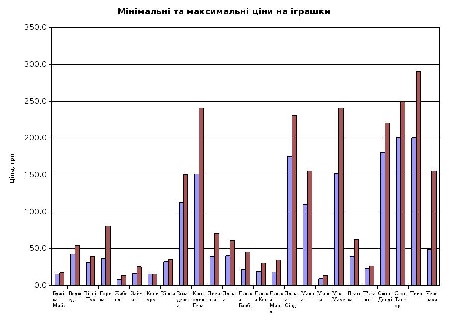 Максимальну та мінімальну ціну на кожну іграшку можна побачити у таблиці Таблиця 6.2. Максимальні та мінімальні ціни на іграшки