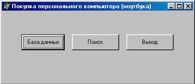 Алгоритм работы программы следующий: при входе в программу мы можем выбрать что будем делать: работать с базой данных, либо создать запрос на поиск компьютера (ноутбука) по имеющемся требованиям. Если выбрана работа с базой данных, то нам доступны стандартные функции работы с базой данных: добавление, редактирование, удаление. Так же мы можем сохранить измененную базу. Если выбрано создание запроса на поиск, то программа предлагает нам выбрать варианты запросов. Затем, если существует, будет выдан оптимальный компьютер, после этого компьютеры, подходящие по двум параметрам и, наконец, компьютеры подходящие только по одному параметру. 4. Описание работы программыТеперь рассмотрим саму программу, написанную на Delphi. При запуске программы появляется заглавная форма (рисунок 2), на которой размещены три кнопки, позволяющие: 1. Кнопка «База данных»: открывает форму работы с базой данных; 2. Кнопка «Поиск»: открывает форму работы с запросами; 3. Кнопка «Выход»: выход из программы.