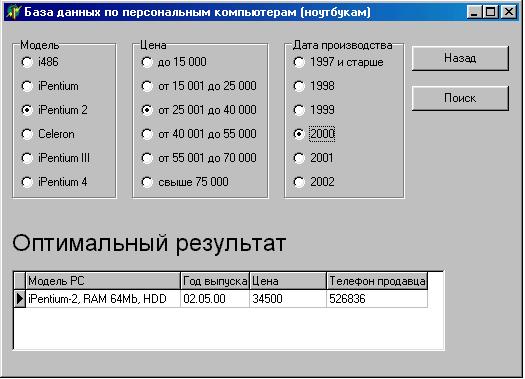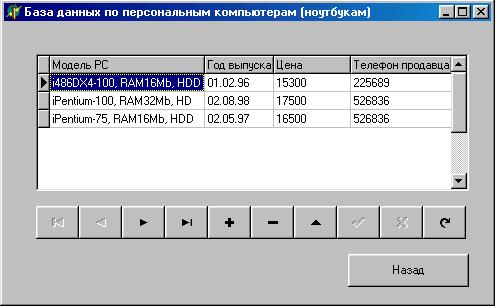 Рис. 3. Форма работы с базой данных. позволяют осуществлять все возможные операции над базой: добавление, редактирование, сохранение, удаление, просмотр. Кнопка “Назад” позволяет вернуться на заглавную форму. При открытии формы работы с запросами (рисунок 4) программа предоставляет осуществить выбор по трем параметрам модели: модели компьютера, цене компьютера и дата выпуска. На рисунке видно, каким образом осуществляется выбор. С помощью языка SQL программа формирует запрос и выдает после нажатия кнопки «Поиск» самый оптимальный вариант, если нажать на кнопку «Поиск» еще раз, будет сделан следующий запрос, менее оптимальный, и так далее. Если же по заданным требованиям не подходит ни один компьютер (ноутбук), не по одному параметру, будет выдано сообщение о несоответствии запроса. Приведем пример: в запросе мы указали модель iPentium-2, не старше 2000 года и по цене от 25 001 до 40 000 тысяч рублей. После нажатия кнопки «Поиск», программа выдаст оптимальный вариант, подходящий по всем трем параметрам – iPentium-2 2000 года за 34 500 тысяч рублей и укажет номер телефона продавца. Если же что-то не устроило, кликнем еще раз на кнопку «Поиск». Тогда программа выдаст нам те компьютеры (ноутбуки), которые подходят по двум параметрам в любом их сочетании. При следующем клике на эту кнопку программа выдаст все компьютеры (ноутбуки), которые подходят хотя бы по одному параметру. |