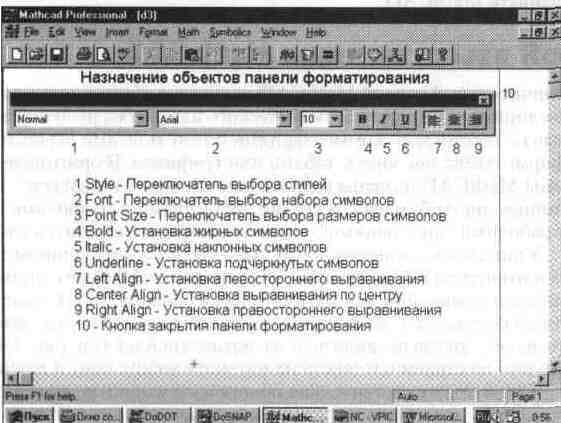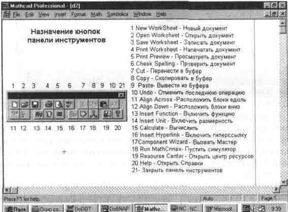 Используя общую наборную панель, можно вывести или все панели сра зу, или только те, что нужны для работы Для установки с их помощью необходимого шаблона (объекта) достаточно поместить курсор в желаемое место окна редактирования (красный крестик на цветном дисплее) и затем активизировать пиктограмму нужного шаблона, установив на него курсор мыши и нажав ее левую клавишу Применение панелей для выбора шаблонов математических знаков очень удобно, поскольку не надо запоминать разнообразные сочетания клавиш, используемые для ввода специальных математических символов. Впрочем, и эта возможность сохранена, так что привыкшие к работе с клавиатурой пользователи, имевшие дело с более ранними версиями системы MathCAD (в том числе и под MS-DOS), могут воспользоваться навыками виртуозного набора формул и после перехода на новую версию системы. Любую панель с математическими знаками можно переместить в удобное место экрана, уцепившись за ее верхнюю часть курсором мыши. Перемещая панель, левую клавишу мыши нужно держать нажатой. В верхнем левом углу каждой наборной панели помещена единственная маленькая кнопка с жирным знаком минуса, служащая для устранения панели с экрана, как только она становится ненужной. Большинство кнопок на панелях выводят общепринятые и специальные математические знаки и операторы, помещая их шаблоны в место расположения курсора на документе. Позже мы последовательно рассмотрим все эти знаки, в том числе на первый взгляд не вполне очевидные. Панель инструментов Третью строку окна системы занимает панель инструментов (Toolbox). Она содержит несколько групп кнопок управления с пиктограммами, каждая из которых дублирует одну из важнейших операций главного меню. Глядя на эти пиктограммы (см. рис. 1. 4), можно легко уяснить их функции. Стоит только остановить курсор мыши на любой из этих пиктограмм, как в желтом окошечке появится текст, объясняющий функции пиктограммы. На рис. 1. 9 представлены названия кнопок панели инструментов и их краткое назначение. Надо отметить, что панель инструментов тоже можно мышью превратить в наборную панель и поместить в любое место экрана. Ее можно закрыть с помощью кнопки с жирным минусом. Так интерфейс системы модифицируется, и пользователь может подстроить его под свой вкус. Рассмотрим действие кнопок быстрого управления системой (номера их соответствуют приведенным на рис. 1. 9). Рис. 1. 9 Назначение кнопок панели инструментов