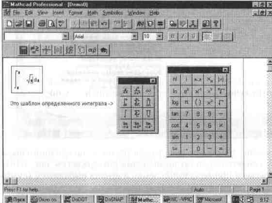 В составе сложных шаблонов часто встречаются шаблоны для ввода отдельных данных. Они имеют вид небольших черных квадратиков. В шаблоне интеграла их четыре: для ввода верхнего и нижнего пределов интегрирования, для задания подынтегральной функции и для указания имени переменной, по которой идет интегрирование. На рис. 1. 11 шаблон интеграла показан в верхнем левом углу окна редактирования документа. Для ввода данных можно указать курсором мыши на нужный шаблон данных и, щелкнув левой ее клавишей для фиксации места ввода, ввести данные. На рис. 1. 12 отражен момент ввода под знаком квадратного корня выражения для задания подынтегральной функции. Для ввода подынтегральной функции в приведенном примере требуется совершить следующие действия: • установив курсор мыши в стороне от места ввода, вывести панель набора арифметических операторов; • подвести курсор мыши под шаблон ввода функции и щелкнуть левой клавишей для фиксации начала ввода; • активизировать (мышью) кнопку со знаком квадратного корня на палитре математических символов; • провести ввод выражения под знаком квадратного корня (при этом возможно редактирование данных с помощью стандартных операций редактирования). Затем таким же способом надо заполнить остальные шаблоны, т. е. ввести пределы интегрирования и имя переменной, по которой производится интег- Рис. 1. 12 Продолжение заполнения шаблона интеграла