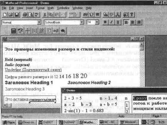 Так же выполняются любые другие разовые вычисления, как простые, так и сложные. Разумеется, есть возможность задавать шаблоны для вычислительных блоков и с клавиатуры, о чем речь пойдет чуть ниже. При задании сложных вычислений работа системы может быть долгой. Чтобы прервать ее, можно нажать клавишу Esc. MathCAD выведет надпись о прерывании вычислений и небольшое окно с двумя командами: OK — подтвердить прерывание и Cancel (Отмена) — отменить прерывание. После прерывания можно возобновить работу, нажав клавишу F9 или сделав активной пиктограмму с изображением жирного знака равенства. Текстовый редактор Текстовый редактор позволяет задавать текстовые комментарии. Они делают документ с формулами и графиками более понятным. В простейшем случае для открытия текстового редактора достаточно ввести символ " (одиночная кавычка). В появившийся прямоугольник можно начать вводить текст. В текстовом блоке визир имеет вид красной вертикальной черточки и отмечает место ввода. Текст редактируется общепринятыми средствами: перемещением места ввода клавишами управления курсором, установкой режимов вставки и замещения символов (клавиша Insert), стиранием (клавиши Del и Backspace), выделением, копированием в буфер обмена, вставкой из буфера и т. д. Выделение и редактирование объектов При редактировании математических выражений важной возможностью является выделение их целиком или в виде отдельных фрагментов. По существу это означает замену одномерного маркера в виде синей вертикальной черты на двумерный в виде выделяющего часть выражения синего уголка (см. рис. 1. 12, на котором этот маркер выделяет введенное выражение). В версии MathCAD 7. 0 выделение с помощью мыши заметно улучшено и практически не отличается от хорошо известного выделения текстовых выражений. Напомним, что для этого достаточно установить текстовый курсор мыши на начало выделяемого фрагмента, нажать левую клавишу мыши и, удерживая ее, двигать маркер к концу выделяемого фрагмента. Выделенный текст помещается на темном фоне (см. на рис. 1. 14 выделенное слово "Сразу" в правом нижнем углу экрана). Выделение надписей обычно производится с целью изменения стиля, размера и типа шрифтов. Для этого достаточно выделить надпись и сменить шрифт или его параметр (рис. 1. 14). Выделения в математических выражениях, хотя и напоминают выделения в тексте, все же более сложны и требуют для быстрого проведения определенных навыков. Обычно выделения в выражениях задаются синим уголком. Он указывает направление ввода. Выделение фрагментов математических выражений необходимо для изменения шрифтов, которыми набирается выражение. Например, для изменения шрифта в математических формулах достаточно выделить одну букву, установив выделение в виде жирной вертикальной черты сразу после буквы. Затем можно воспользоваться средствами модификации шрифтов. Рис. 1. 14 Примеры выделения и редактирования надписей и организации гиперссылки
