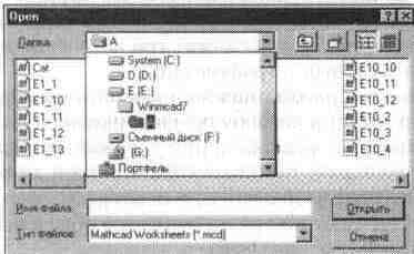 Следует отметить, что изменение параметров и типов шрифтов для определенных объектов (например, переменных или констант) действует глобально. Так, если увеличить размеры обозначения какой-либо переменной, то все обозначения других переменных тоже будут увеличены. Создание гиперссылок Выделение используется также для копирования в буфер обмена и организации гиперссылки. Гиперссылка в MathCAD 7. 0 дает связь выделенного текстового фрагмента с некоторым файлом. Для этого вначале фрагмент выделяется, а затем нажимается кнопка панели инструментов Insert Hyperlink. В появившемся простом окне надо указать полное (с путем) имя файла, который будет загружаться и отображаться в момент активизации фрагмента — гиперссылки. Можно также задать сообщение об ошибке, если файл не будет найден. На рис. 1. 14 показан случай, когда с гиперссылкой связан файл Demo с демонстрацией работы MathCAD, на рисунке виден угол окна с документом этого файла. С помощью гиперссылок можно готовить в среде MathCAD 7. 0 электронные учебники и книги высокого качества, имеющие множество гиперссылок, качественные тексты с разнообразными выделениями, математические формулы и графики. Важно отметить, что такие учебники являются "живыми": все примеры в них работают и их можно использовать с различными исходными данными, задаваемыми учениками. О конструировании и редактировании математических выражений можно говорить много и долго, в книге [14] этой теме посвящена целая глава. Однако в целом этот процесс интуитивный и учитывает тонкости конструирования математических выражений. Главное здесь практика! Мы еще вернемся к описанию некоторых правил конструирования математических выражений (формул). 1. 6. Создание, загрузка, сохранение и распечатка документа Создание нового документа Кнопка New Worksheet с изображением чистого листа служит для создания нового документа. Она очищает окно редактирования и задает имя документа Untitled N, где N — порядковый номер документа. После этого можно начинать вводить документ с клавишного пульта с применением (при необходимости) палитр математических знаков и функций. Загрузка документа Наряду с вводом своих простых документов с клавиатуры бывает полезно опробовать в работе ранее созданные (в том числе демонстрационные) документы. Для этого достаточно активизировать вторую пиктограмму с изображением открывающейся папки или воспользоваться командой Open (Открыть) в позиции File (Файл) главного меню системы. Тогда появится диалоговое окно поиска файла загружаемого документа (см. рис. 1. 15). Рис. 1. 15 Диалоговое окно поиска файла документа
