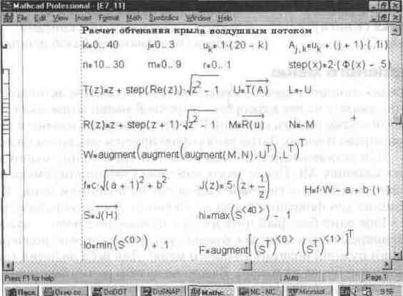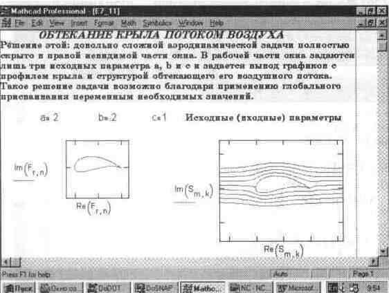 Вставка блоков из буфера обмена в документ Если нажать кнопку Paste или клавишу F4 (не меняя положения курсора мыши), исчезнувшие блоки вновь появятся на своем месте и вид документа будет подобен показанному ранее на рис. 1. 13. Зацепив курсором мыши любой из выделенных блоков и нажав ее левую клавишу, можно (удерживая эту клавишу) перетаскивать блоки с одного места на другое. Расположение блоков в документе Расположение блоков в документе имеет принципиально важное значение. Как уже отмечалось, их выполнение происходит справа налево и сверху вниз. Поэтому блоки не должны взаимно перекрываться (хотя небольшое перекрытие обычно не существенно). Указанный порядок исполнения блоков означает, что, например, при построении графика функции или таблицы ее значений вначале должны исполняться блоки, задающие саму функцию и пределы изменения аргумента, а уже затем блок, задающий вывод таблицы или построение графика функции. Все это — следствие работы системы в интерпретирующем режиме. Доступная область окна редактирования по горизонтали превышает видимую на экране. При этом область окна делится длинной вертикальной линией на две части, левую и правую Горизонтальными линиями документ делится на страницы Можно разместить некоторые вспомогательные вычисления в правой, невидимой, части окна, а в левую, видимую, вынести задание исходных данных и вывод результатов расчетов Этот прием часто используется в пакетах с примерами применения системы, а также в учебно-демонстрационных программах На рис 118 показан пример подобного решения довольно сложной аэродинамической задачи по построению профиля крыла самолета и линий обтекания его воздушным потоком Рис. 1. 18 Пример решения аэродинамической задачи (видимая часть решения)