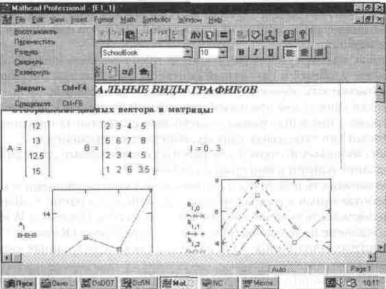 Другой любопытный и полезный прием был использован в прежних версиях системы под MS-DOS — выделение вычисления в невидимой правой части окна надписью /equations В этом случае все вычисления после их ло1 иче-ского вызова выполняются сверху вниз с возвратом к месту их вызова в левой части экрана. Из новой версии этот полезный прием по не совсем понятным мотивам исключен Возможно, разработчики сочли, что вполне достаточно описанных выше приемов Интересно отметить, что с версией MathCAD PLUS 7 0 можно использовать документы, подготовленные в среде предшествующей версии Это позволяет считать последние версии систем практически совместимыми 1. 8. Главное меню системы Состав главного меню Верхняя строка окна системы содержит указание на имя системы или текущего открытого окна Следующая строка содержит позиции главного меню Их назначение приведено ниже File (Файл) — работа с файлами, сетью Internet и электронной почтой, Edit (Правка) — редактирование документов, View (Обзор) — изменение средств обзора, Insert (Вставка) установка вставок объектов шаблонов (включая графику), Format (Формат) — изменение формата объектов, Math (Математика) — управление процессом вычислений, Graphics (Графика) — работа с графическим редактором, Symbolic (Символика) — выбор операций символьного процессора, Window (Окно) — управление окнами системы; Books (Книги) — работа с электронными книгами; Help (?) — работа со справочной базой данных о системе. Активизация главного меню Каждая позиция главного меню может быть сделана активной. Для этого достаточно указать на нее курсором — стрелкой мыши и нажать ее левую клавишу. Можно также нажать клавишу F10 и использовать клавиши перемещения курсора вправо и влево. Затем выбор фиксируется нажатием клавиши ввода Enter. Для активизации главного меню без применения мыши достаточно нажать клавишу Alt. После этого, нажимая клавиши перемещения курсора, можно перемещать световое выделение по позициям меню. Выбрав нужную позицию для фиксации ввода ее операции, достаточно нажать клавишу Enter. Еще один быстрый путь входа в нужное подменю — нажатие клавиши Alt и одновременно клавиши с буквой, которая на экране подчеркнута снизу в названии нужной позиции главного меню. Для всех позиций главного меню это прописная буква их имени. Важно не путать регистры смены языков и вводить соответствующую операцию латинскими буквами. Если какая-либо позиция главного меню делается активной, она выводит ниспадающее подменю со списком доступных и недоступных (но возможных в дальнейшем) операций (команд). Доступные в данный момент операции даны четким шрифтом, а недоступные — шрифтом с характерным затенением, но позволяющим все же прочесть название операции. Перемещение по списку подменю и выбор нужной операции производятся аналогично тому, как это описано для главного меню, с той лишь разницей, что при управлении с клавиатуры используются клавиши перемещения курсора по вертикали. Подменю управления главным окном В начале титульной строки имеется кнопка с изображением счетов на фоне буквы М. Она служит для ввода стандартных операций с главным окном системы, принятых в системе Windows 95. Если эта позиция активна, то появляется подменю со следующими операциями (см. рис. 1. 20): Restore (Восстановить) — раскрыть окно приложения из пиктограммы; Move (Переместить) — переместить окно приложения; Size (Разме