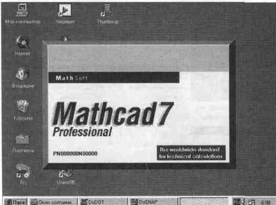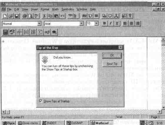 Рис. 1. 1 Группа значков MathCAD 7. 0 PRO в рабочем меню операционной системы Windows 95 В прежних версиях MathCAD под Windows пиктограмма запуска имела вид калькулятора Некоторые пользователи поневоле из-за этого отождествляли MathCAD с микрокалькулятором в Windows Однако они отличаются примерно так же, как космический "челнок" отличается от бумажного голубка Видимо, учтя это, MathSoft изменила пиктограмму, изобразив ее в виде счетов, — вряд ли кто-либо заподозрит, что MathCAD 7 О PRO уподобляется этаким большим электронным счетам Запустив MathCAD из Windows, вы на некоторое время (зависит от быстродействия ПК) увидите довольно скромное титульное окно (рис 1 2) Оно вскоре сменится основным окном системы (рис 1 3) Последнее представляет собой некий гибрид типового окна Windows программ и диалогового окна, столь привычного для пользователей ранних версий MathCAD Обычно при первой загрузке системы ее окно появляется не полностью открытым и вокруг него видны пиктограммы других приложений менеджера программ Windows 95 Однако на рис 1 3 основное окно MathCAD раскрыто на весь экран, пользователи Windows 95 знают, что для раскрытия окна надо активизировать среднюю из трех кнопок, расположенных в правом верхнем углу основного окна системы При запуске системы в центре основного окна обычно появляется меньшее окно — Tip of the Day, — которое позволяет быстро ознакомиться с возможностями MathCAD Однако для наших пользователей польза от этого окна весьма сомнительна, поскольку описание дано на английском языке Для переключения тем служит кнопка Next Tip, а для перехода к работе с MathCAD — кнопка ОК Можно отключить появление этого окошка, удалив мышью птичку в прямоугольнике в нижнем левом углу окошка Tip of the Day Рис. 1. 2 Титульная заставка системы MathCAD PLUS 6. 0 PRO