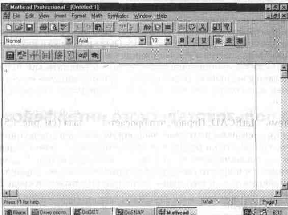 Как известно, Windows 95 позволяет быстро переключаться с решения одной задачи на решение другой (в частности, путем одновременного нажатия клавиш Alt и Tab). Возможно также управление окнами различных приложений. Для этого в правом верхнем углу окна MathCAD помещены три кнопки в виде маленьких квадратов. Левая кнопка сворачивает окно, сохраняя MathCAD активным. При этом в строке задач Windows 95 (внизу экрана) появляется кнопка с пиктограммой системы и ее названием. Если загружены и другие приложения Windows 95, то и их кнопки будут видны в строке задач; активизируя их, можно делать активным то или иное приложение. Средняя кнопка, как отмечалось, выполняет функции переключения размеров окна: она раскрывает окно на весь экран или задает окно в уменьшенном размере. При этом окно можно растягивать в разных направлениях, уцепившись за его ограничительные линии или углы курсором мыши. В этом случае курсор приобретает вид тонких двухсторонних стрелок, указывающих на направление, в котором можно растягивать или сужать окно. Третья кнопка (с жирным наклонным крестиком) служит для закрытия окна. При этом работа с приложением (MathCAD или другим) завершается в соответствии с определенными правилами. Обычно, если в приложение был загружен файл и он модифицировался, то при закрытии приложения появляется временное окно с предложением сохранить файл. С помощью клавиш Alt и Tab (табуляция) в Windows можно быстро переключаться из одного приложения в другое, например из текстового редактора или программы AutoCAD в MathCAD. При этом (что является принципиальным отличием от работы в среде MS-DOS) работа каждого приложения временно прекращается в том состоянии, какое было перед переключением окон. С этого же состояния приложение начинает работать, как только его окно снова делается активным. Переключение приложений удобно осуществлять из строки задач операционной системы, обычно расположенной внизу экрана. 1. 3. Основы пользовательского интерфейса Под интерфейсом пользователя подразумевается совокупность средств графической оболочки MathCAD, обеспечивающих легкое управление системой как с клавишного пульта, так и с помощью мыши. Под управлением понимается и просто набор необходимых символов, формул, текстовых комментариев и т. д., и возможность полной подготовки в среде MathCAD документов (Worksheets) и электронных книг с последующим их запуском в реальном времени. Пользовательский интерфейс системы создан так, что пользователь, имеющий элементарные навыки работы с Windows-приложениями, может сразу начать работу с MathCAD. Интерфейс системы внешне очень напоминает интерфейс широко известных текстовых процессоров Word 7. 0/8. 0 под Windows 95. Это, в частности, позволило несколько сократить описание общепринятых для Windows-приложений деталей работы с ними. Окно редактирования Сразу после запуска система готова к созданию документа с необходимыми пользователю вычислениями. Первая же кнопка панели инструментов (с изображением чистого листка бумаги) New Worksheet позволяет начать подготовку нового документа. Соответствующее ему окно редактирования получает название Untitled: N, где N — порядковый номер документа, который начинается с цифры 1. Вначале окно редактирования очищено (рис. 1. 4). Задание различных стилей новых документов мы рассмотрим в следующей главе. Если в систему с помощью второй кнопки (в виде открывающе