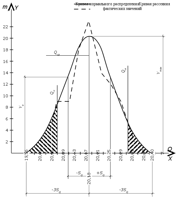 Вероятность ошибки τ (%) – по верхнему пределу, τв = [0,5–Ф(Zв)]·100%=[0,5–Ф(1,86)]·100%=3,14% – по нижнему пределу, τн = [0,5–Ф(Zн)]·100%=[0,5–Ф(-1,52)]·100%=6,43% Рис. 2. Кривая рассеяния фактических значений и кривая нормального распределения