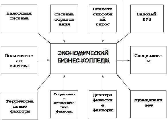 Система – это конечное множество функциональных элементов и отношений между ними, выделенная из внешней среды с определенной целью в рамках некоторого временного интервала.Как я уже говорила, за систему в данной контрольной работе я приняла Экономический бизнес-колледж г.Москвы (ЭБК). На организацию (систему) находящуюся как в рентабельном так и нерентабельном состоянии (в данном случае в рентабельном) влияют многие внешние факторы, которые в понятиях рыночной экономики называют «макроокружением», а с точки зрения ТО и СА – внешней средой.Внешняя среда – есть совокупность всех объектов, изменение свойств которых влияет на систему, а также тех объектов, чьи свойства меняются в результате поведения системы. На данном ниже примере (рис.2) видно, что ЭБК находится под влиянием внешних факторов окружающей его среды. Это и социально-экономические и демографические (что тоже не маловажно) факторы, а также ряд других (налоговая служба (система), Базовый ВУЗ (МШБ) и др.