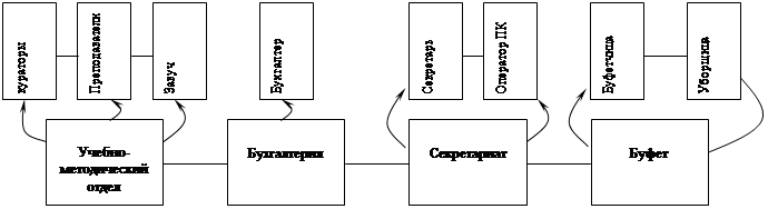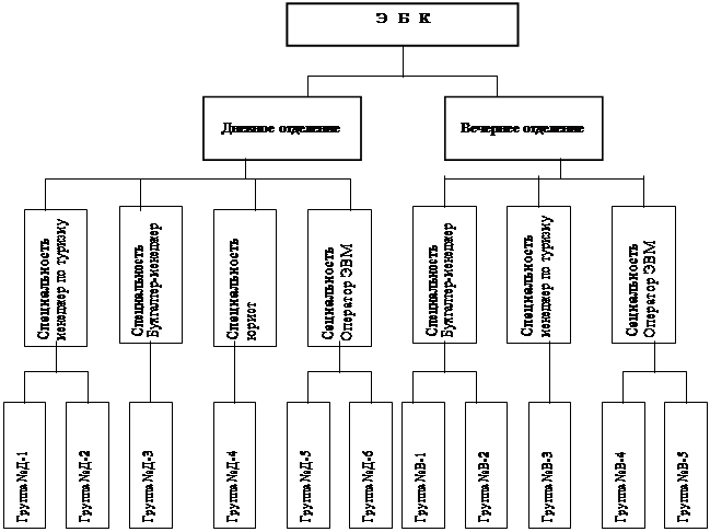 Ч А С Т Ь 1 ВВЕДЕНИЕ Организация – это объект, обладающий упорядоченной внутренней структурой. В нем сочетаются многообразные связи (физические, технологические, экономические, правовые) и человеческие отношения. Организация как объект представляет собой целостный комплекс взаимосвязанных элементов (свойство организационной сложности) и особое единство с внешним окружением. Для нее характерна целенаправленность функционирования и развития. Она самоорганизующая система на всех этапах своего жизненного цикла. Именно такое понимание и положено в основу всего комплекса знаний о теории организации. Организации создают структуры, чтобы обеспечить координацию и контроль деятельности своих подразделений и работников. Структуры организаций отличаются друг от друга сложностью, формализацией, соотношением централизации и децентрализации. Структурные взаимосвязи в организациях находятся в центре внимания многих исследователей и руководителей. Для эффективного достижения цели необходимо понимание структуры работ, подразделений и функциональных единиц. Организация работы и людей во многом влияет на поведение работников. Структурные и поведенческие взаимосвязи, в свою очередь, помогают установить цели организации, ориентирование на их достижение. К организациям относятся различные образования (предприятия, коммерческие фирмы, учебные и научные организации и др.) Структура организации – это те фиксированные взаимосвязи, которые существуют между подразделениями и работниками организации. Ее можно понимать как установленную схему взаимодействия и координации технологических и человеческих элементов. I. Организация является одним из частных элементов системы. Суть данной контрольной работы представить организацию как систему, исследовать ее с помощью методов системного анализа, с применением соответствующих математических и эвристических (интуитивных) методов. В качестве математических методов используем методы теории графов. За систему я приняла Экономический бизнес колледж города Москвы (ЭБК), который является обособленным структурным подразделением Международной Школы Бизнеса (МШБ) и начал свою работу в 1996 году в городе Москве. ЭБК осуществляет подготовку специалистов со средним специальным профессиональным образованием, а также повышение квалификации и переподготовку кадров. 1.1. Структура может быть простой или сложной в зависимости от числа и типа взаимосвязей между частями системы. В сложных системах должна существовать иерархия, т. е. упорядочение уровней подсистем, частей и элементов. От типа и упорядоченности взаимоотношений между компонентами системы в значительной степени зависят функции систем и эффективность их выполнения. В данном учебном заведении используется иерархическая структура. Она характерна тем, что реализует все виды связей, т.е. предполагает выполнение каждым работником определенной работы, функциональные связи между исполнителями, линейные – руководителя с исполнителем, характеризуется передачей управленческого воздействия в виде конкретного набора функций:Рис.1 Иерархическая структура управления ЭБК